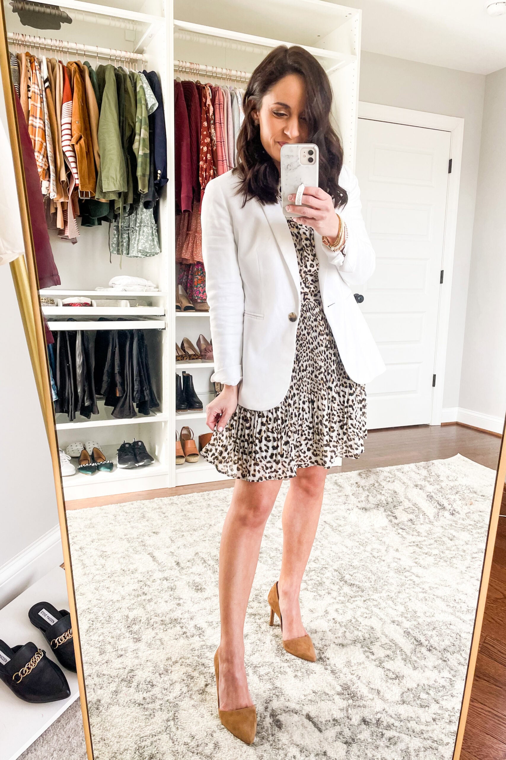 White Blazer | Leopard Top | Demi Boot Jeans | Shoes (similar) | Bracelet | Earrings | Necklace