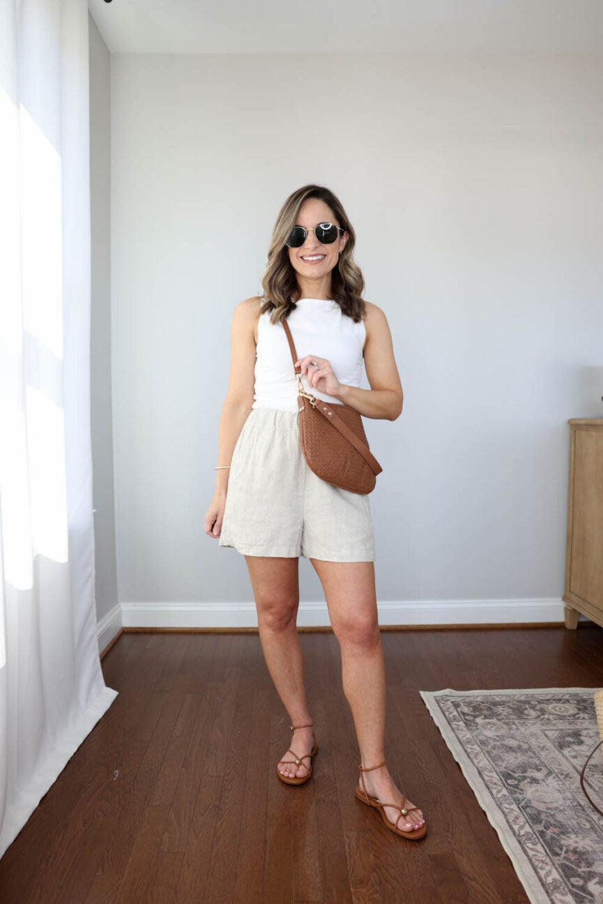 Linen Shorts: J.Crew XXS in flax | White Tank Top: Quince XS | Denim Shirt: Target XS | Sandals: Dolce Vita TTS | Woven Crossbody | Earrings