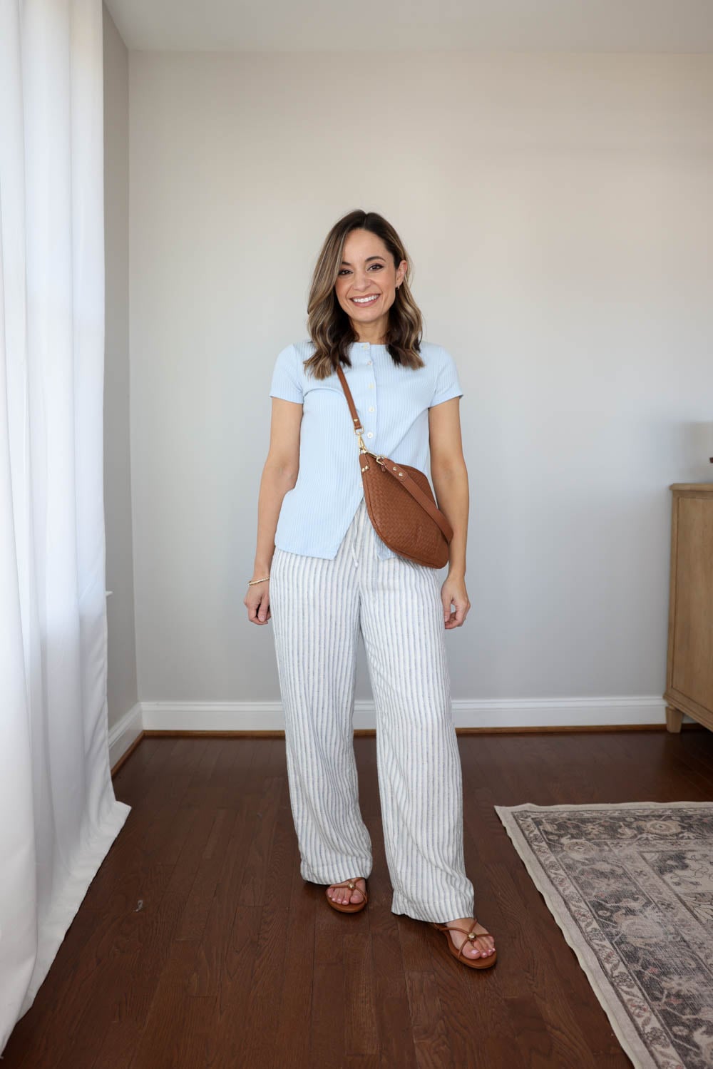 Linen Blend Pants: Abercrombie XXS Short | Light Blue Top: Old Navy Petite XS | Sandals: Dolce Vita TTS | Woven Crossbody | Earrings