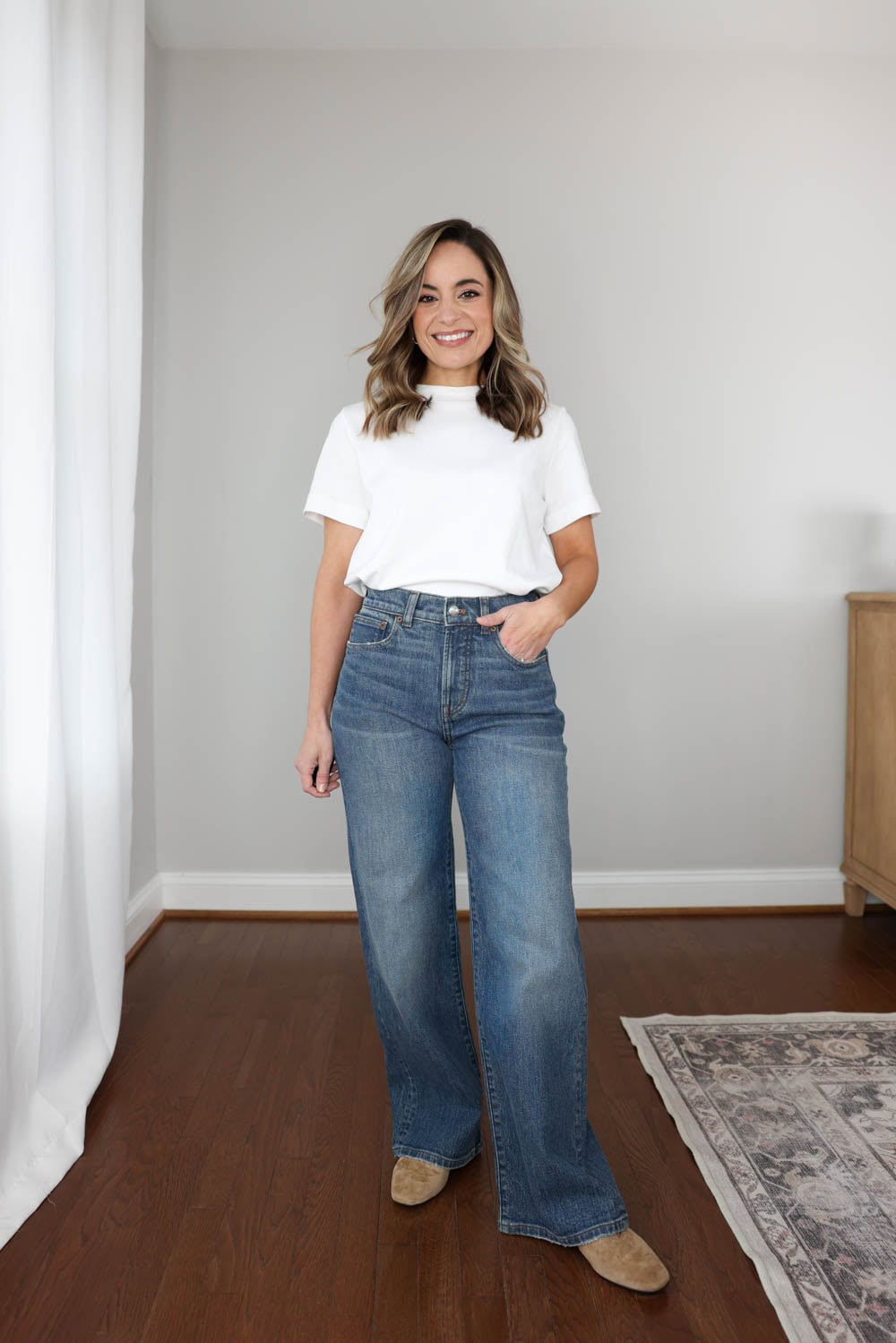 The ’90s Crewneck Tee from Madewell is a slim, cropped T-shirt made from 100% cotton. I like this one for the shorter length and fitted silhouette, and the sleeve length is just right—not too long or bulky.
