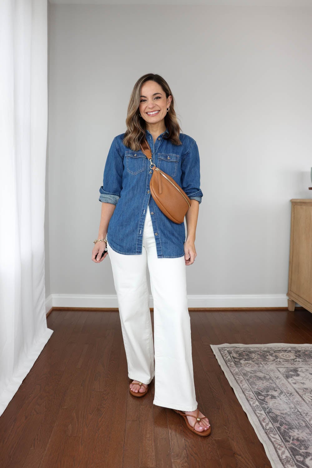 White Wide-Leg Jeans: Banana Republic Factory Petite 24 in White | Denim Button Down Top: J.Crew Petite 00 Sandals | Straw Bag | Sling Bag | Earrings