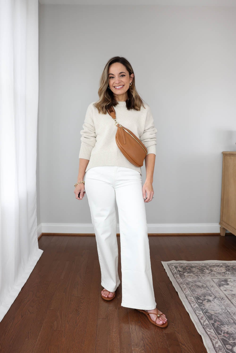 White Wide-Leg Jeans: Banana Republic Factory Petite 24 in White | White T-Shirt: Quince XS | Beige Sweater: Quince XS in Speckled Beige | Sandals | Straw Bag | Earrings