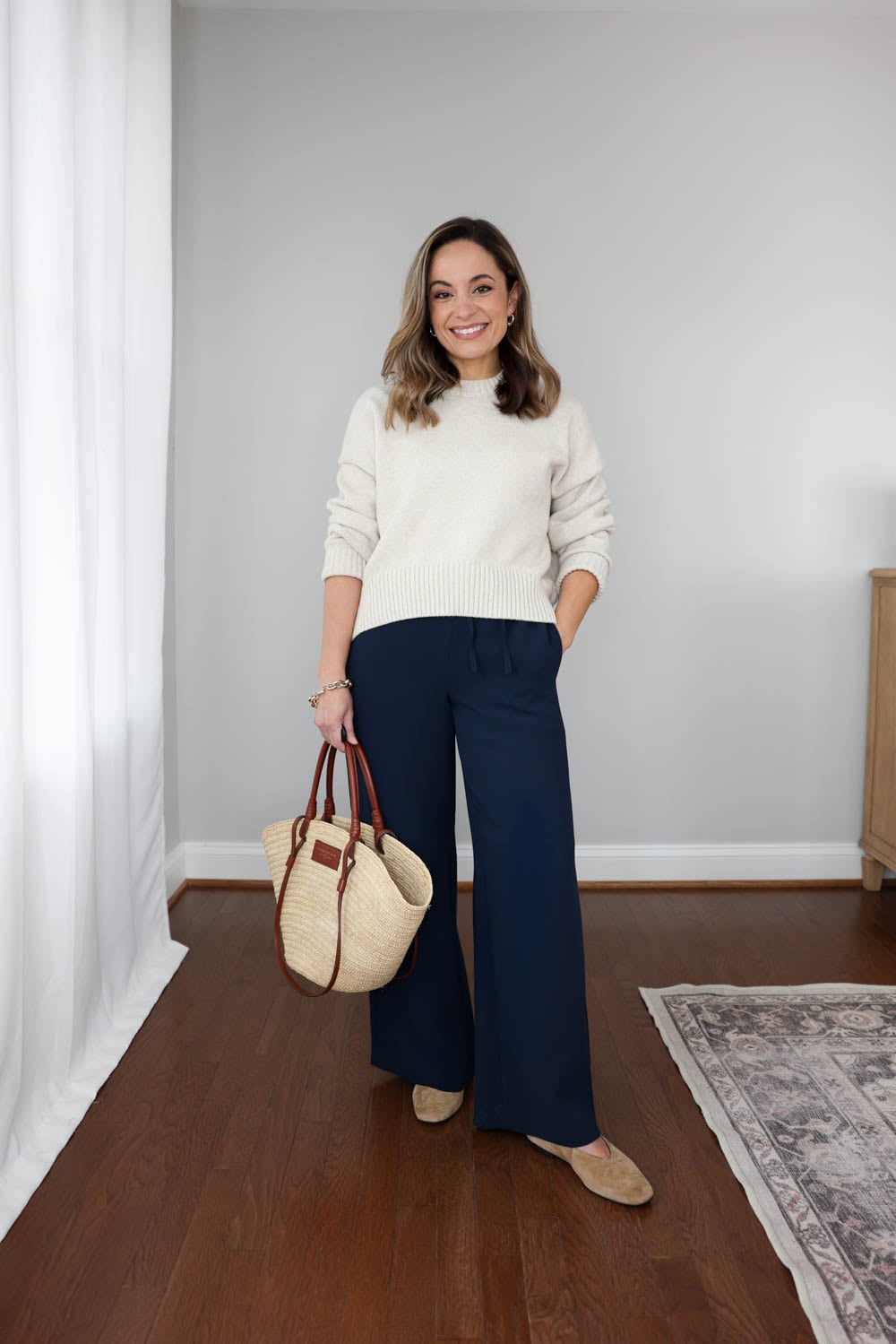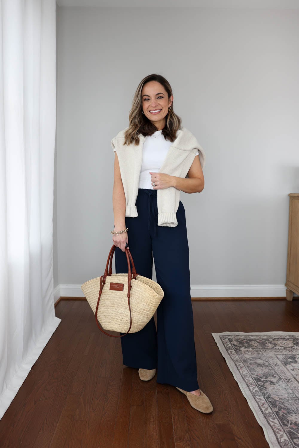 Navy Crepe Wide-Leg Pants: Artizia XXS Short in Admiral | White T-Shirt: Quince XS | Beige Sweater: Quince XS in Speckled Beige | Flats | Straw Bag | Earrings