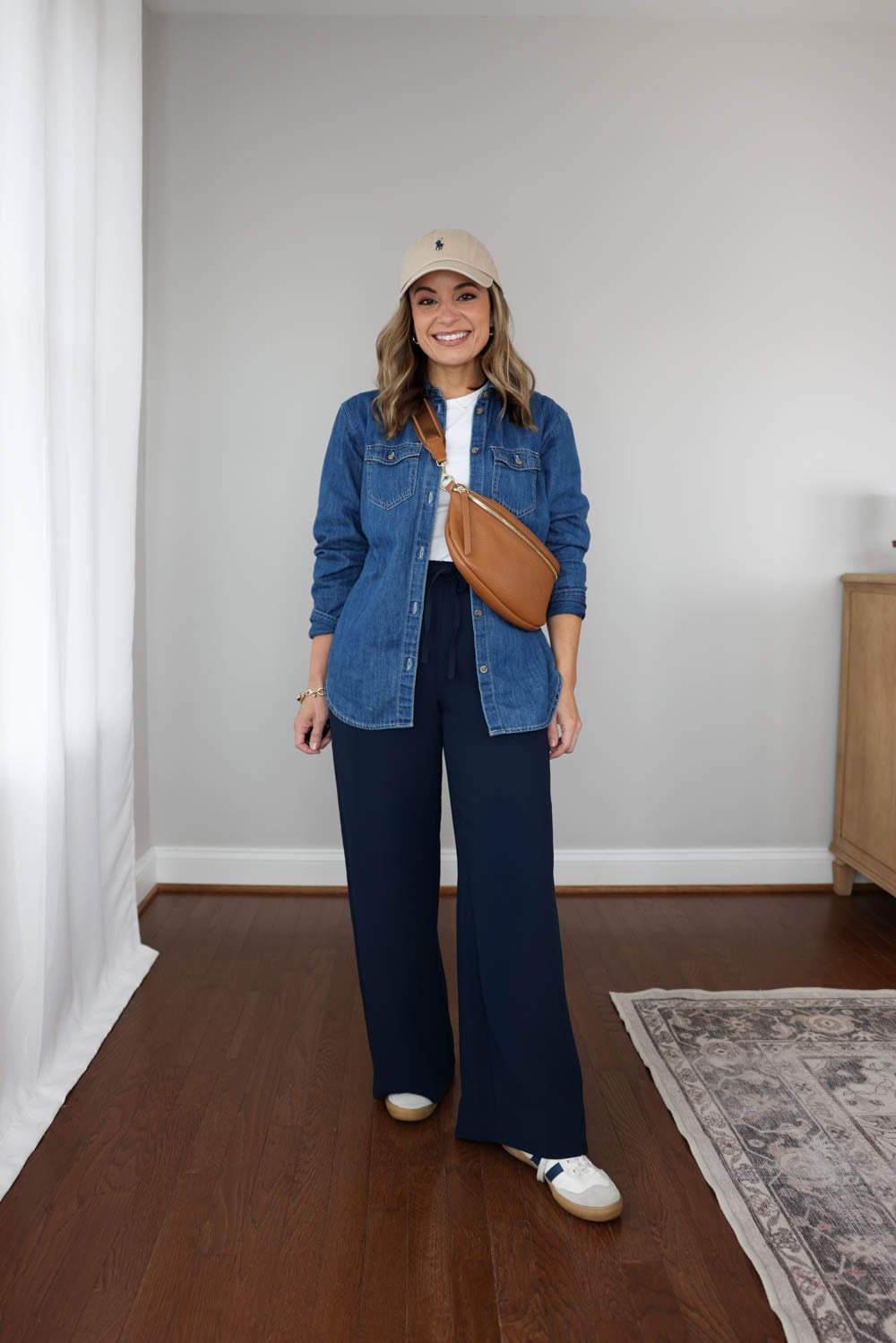 Navy Crepe Wide-Leg Pants: Artizia XXS Short in Admiral | White T-Shirt: Quince XS | Denim Button Down Top: J.Crew Petite 00 | Sneakers | Sling Bag | Hat | Earrings |