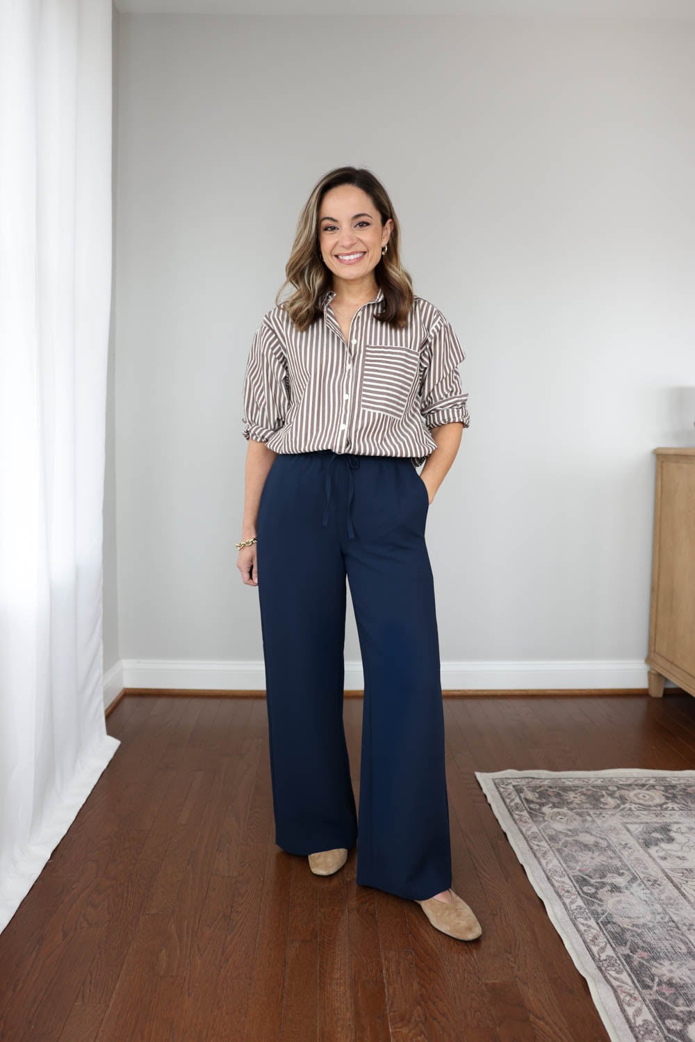 Navy Crepe Wide-Leg Pants: Artizia XXS Short in Admiral | Striped Button Down Top: LOFT Petite XXS | Flats | Straw Bag | Earrings