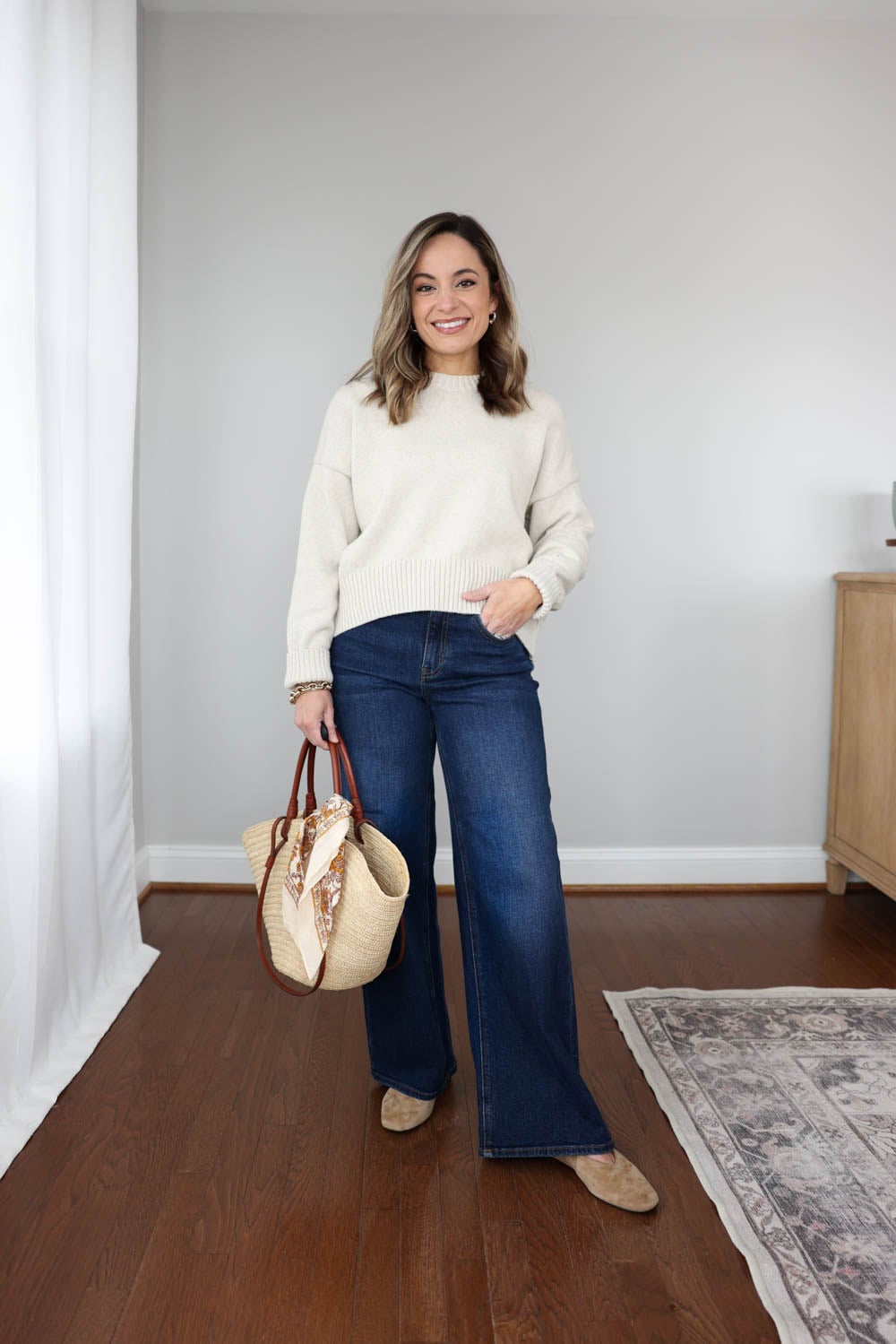 Dark Wash Wide-Leg Jeans: Quince 24 x 28″ in Midnight Blue | White T-Shirt: Quince XS | Beige Sweater: Quince XS in Speckled Beige | Flats | Straw Bag | Earrings | Scarf
