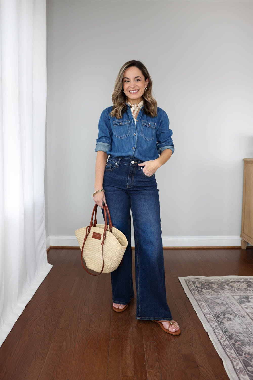 Dark Wash Wide-Leg Jeans: Quince 24 x 28″ in Midnight Blue | Denim Button Down Top: J.Crew Petite 00 | Sandals | Straw Bag | Earrings | Scarf