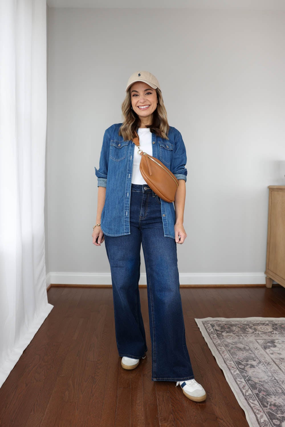 Dark Wash Wide-Leg Jeans: Quince 24 x 28″ in Midnight Blue | White T-Shirt: Quince XS | Denim Button Down Top: J.Crew Petite 00 | Sneakers | Sling Bag | Hat | Earrings