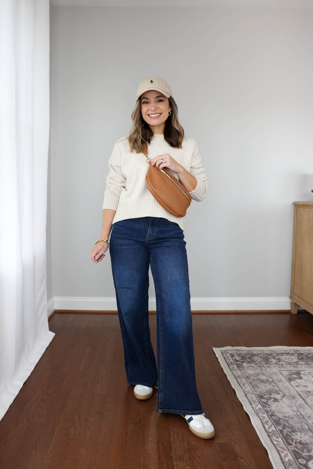 Dark Wash Wide-Leg Jeans: Quince 24 x 28″ in Midnight Blue | White T-Shirt: Quince XS | Beige Sweater: Quince XS in Speckled Beige | Sneakers | Sling Bag | Hat | Earrings