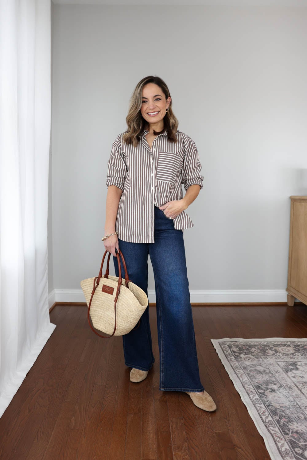 Dark Wash Wide-Leg Jeans: Quince 24 x 28″ in Midnight Blue | Striped Button Down Top: LOFT Petite XXS | Flats | Straw Bag | Earrings