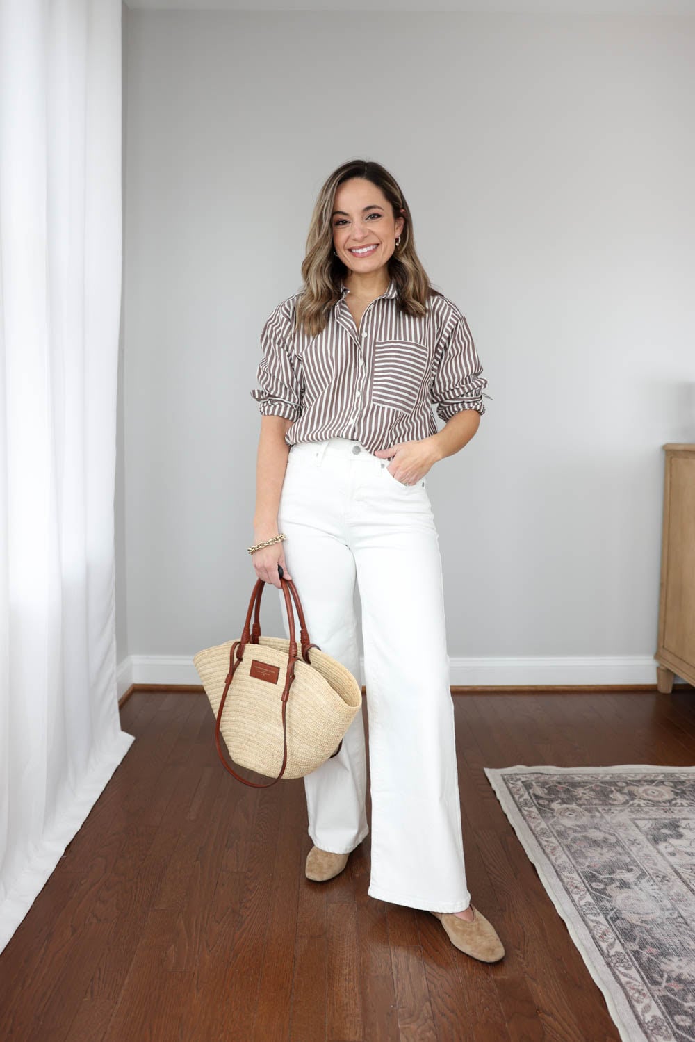 White Wide-Leg Jeans: Banana Republic Factory Petite 24 in White | White T-Shirt: Quince XS | Striped Button Down Top: LOFT Petite XXS | Sandals | Straw Bag | Earrings | Belt