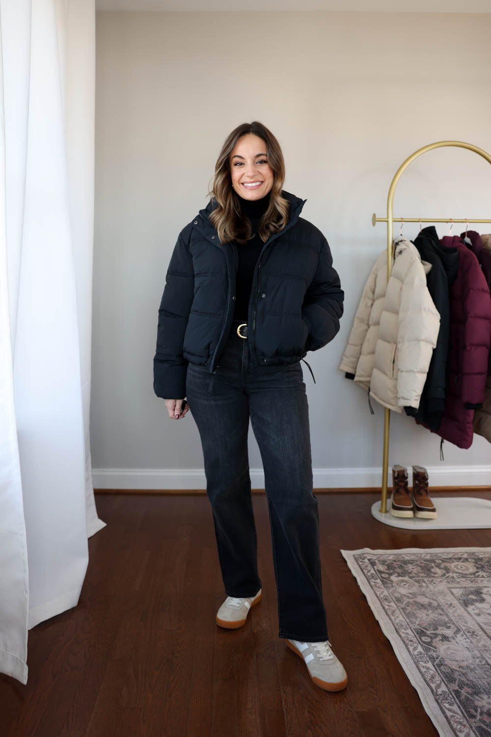 This petite-friendly puffer coat under $60 is warm, comfortable, and overall well-proportioned for petites (mostly through the sleeves). I’m wearing it here in Petite XS, and it has a roomy fit. The sleeves hit at just the right length, and the adjustable waist cinch helps define your shape. While the coat is cozy and great for cold weather, it does have a voluminous look—so I recommend sizing down for the best petite fit.