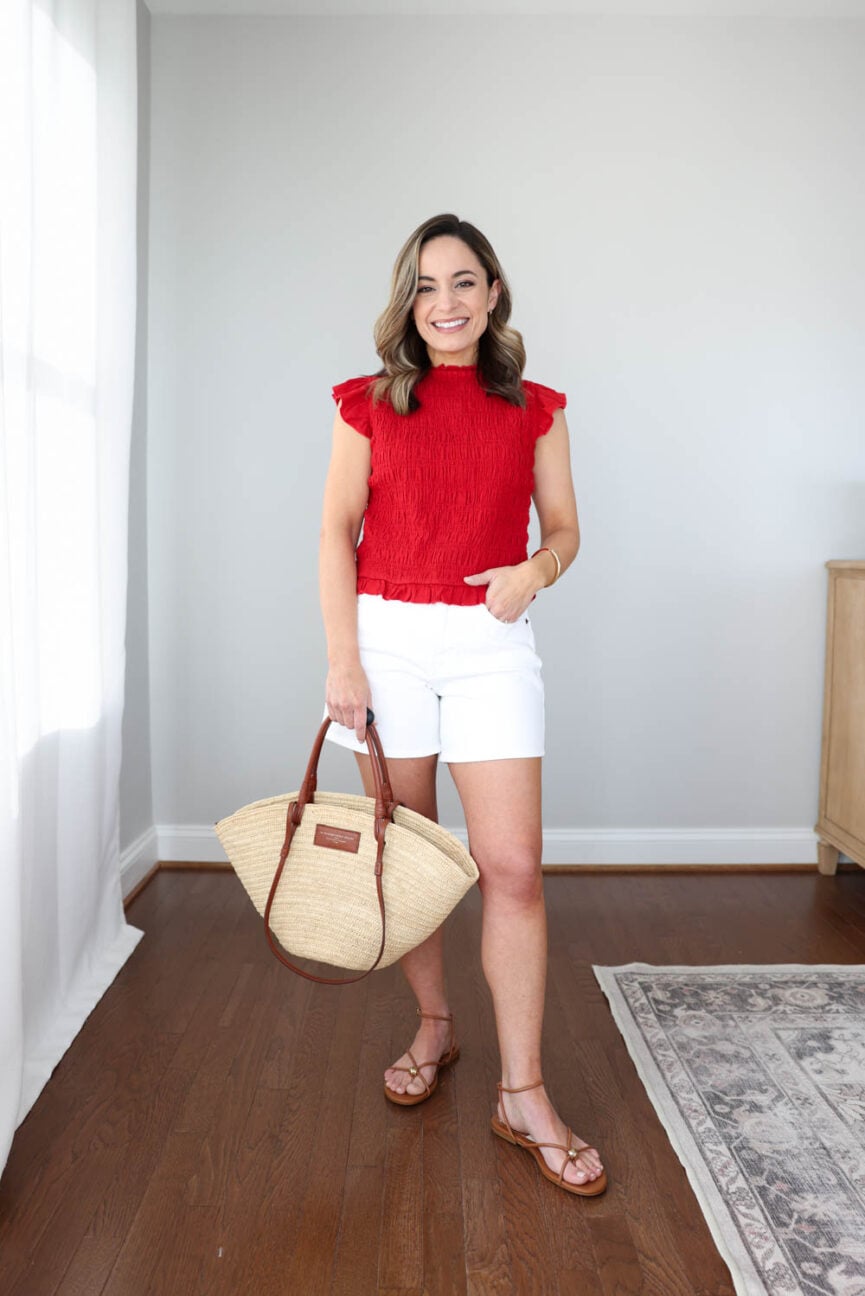 Shorts 25 sized up | Red Top XS | White Top XS | Crossbody Bag shortened strap with this tool | Sandals tts | Straw Bag