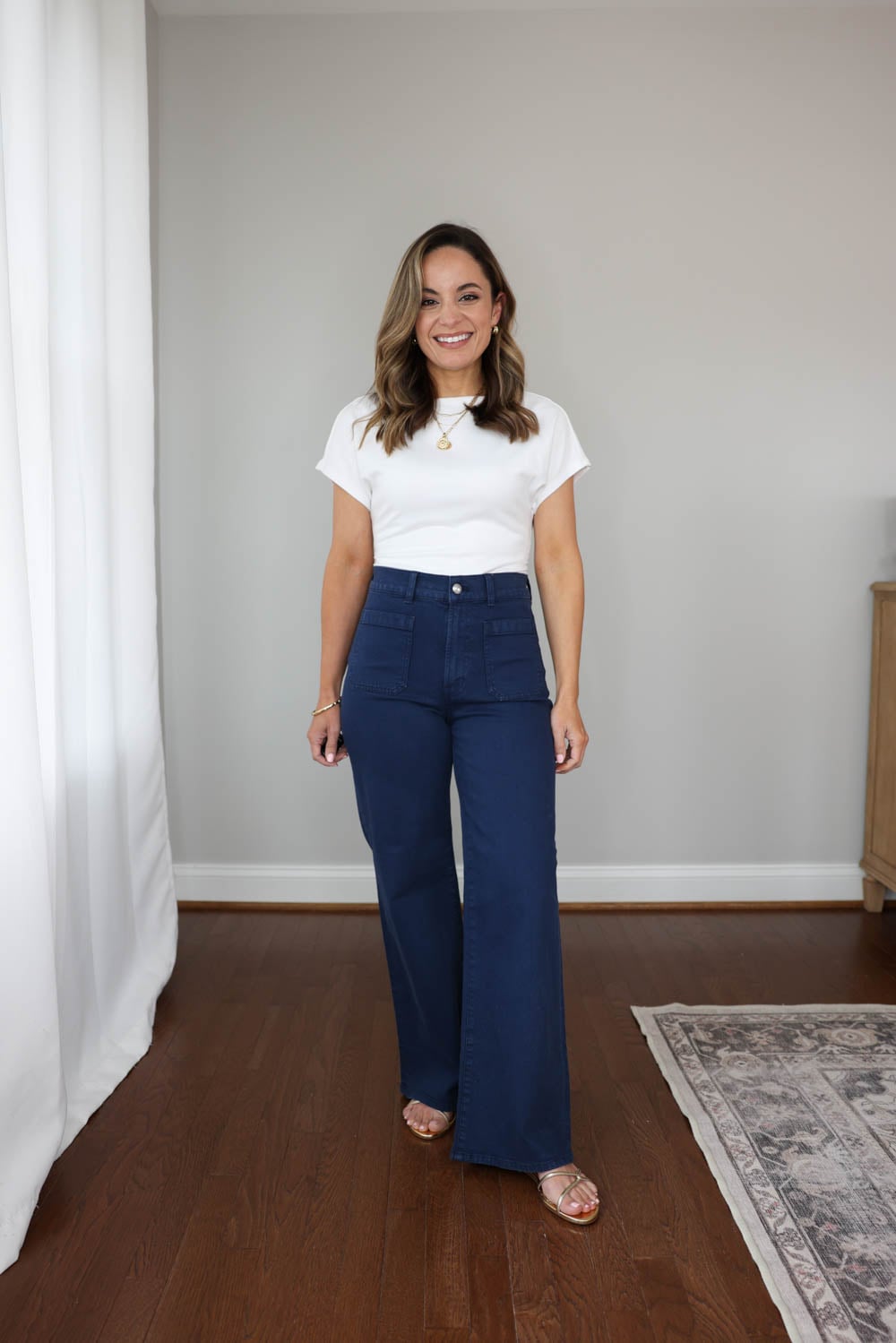 I especially love the higher 11″ rise. I usually struggle with front patch pockets because they can make my hips look wider, but the rise on these balances everything out and feels more flattering on my frame. The shade of blue is also a standout—something a little different from your typical denim.