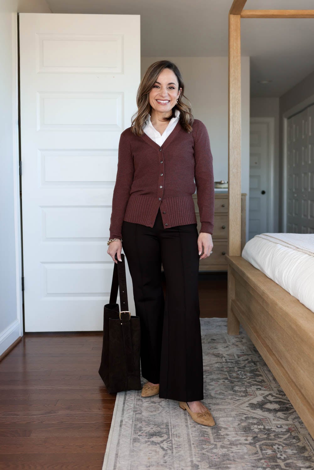 This pair is very similar to the straight style, but with a cropped flare. I chose standard sizing instead of petite, so they wouldn’t feel cropped, which gives them a perfect full-length fit on my frame. They have the same comfortable stretch as the pair above, and I love the rich brown color. I also sized up in these for the best fit, and they’ll be included in my capsule wardrobe as well.