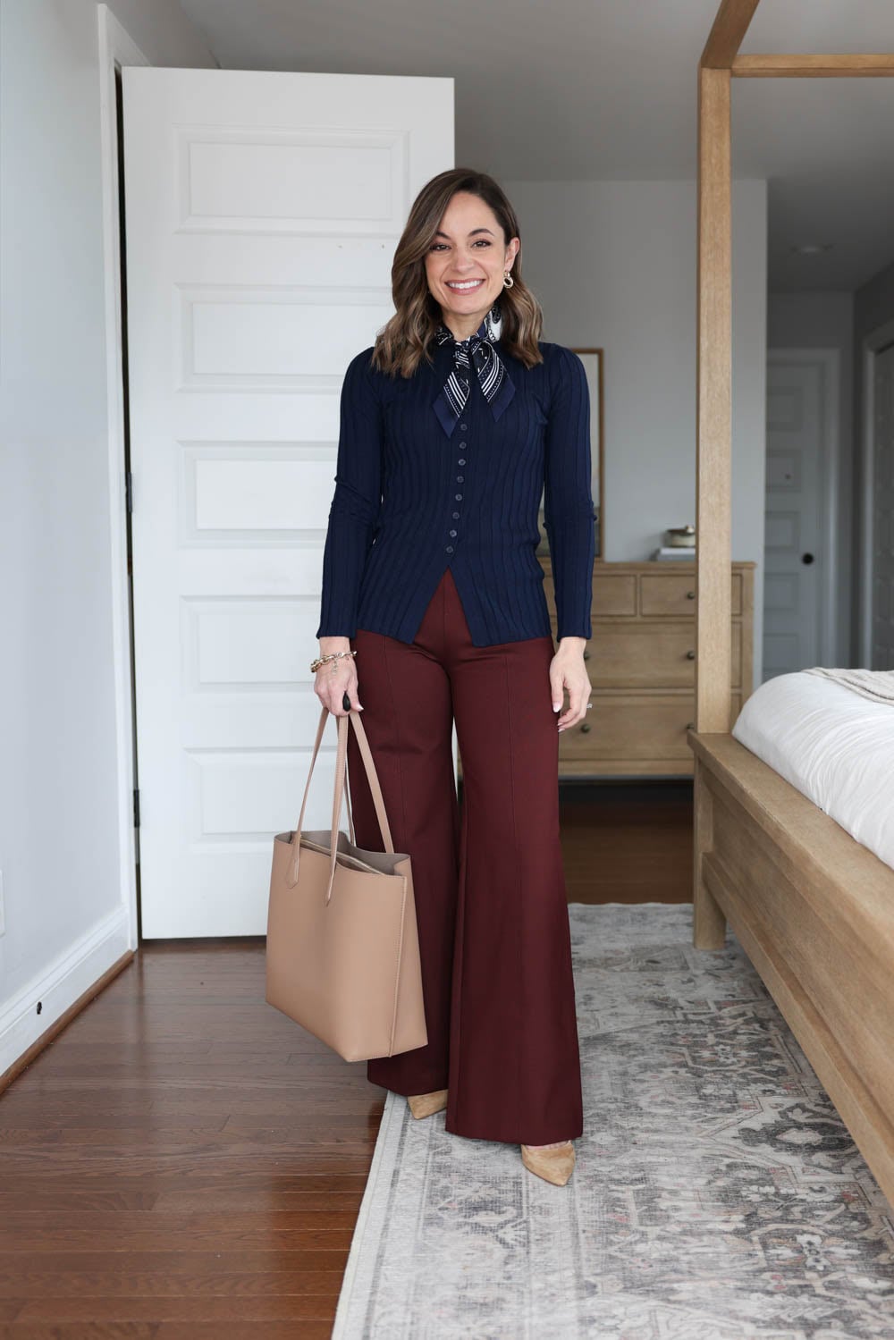 I love the rich combination of burgundy and chocolate brown—it’s warm, polished, and a little unexpected. My exact blazer is a crepe style from Ann Taylor, but it’s unfortunately sold out, so I’ve linked a similar option for you instead.