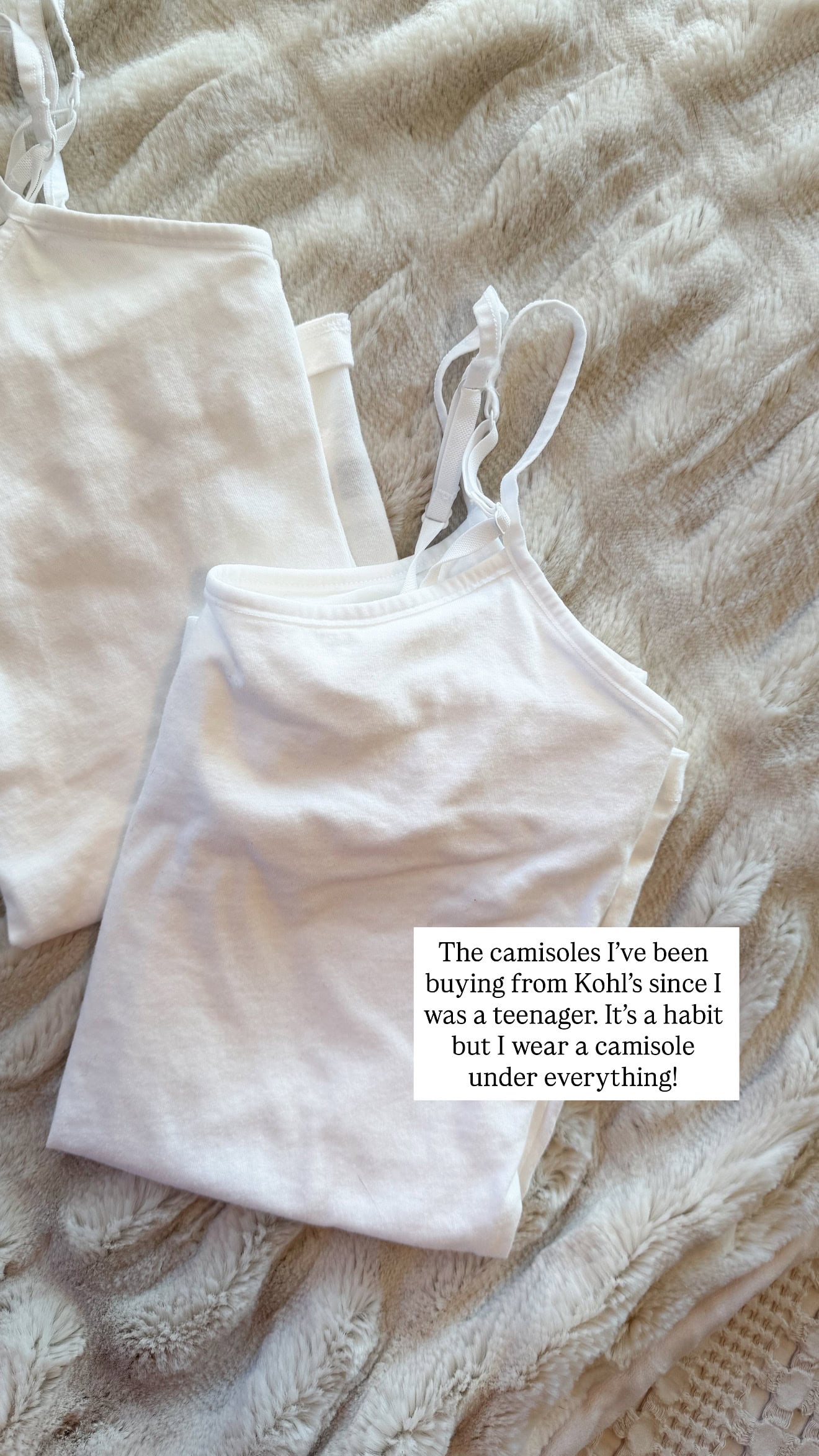Maybe it’s the millennial in me, but I’ll never stop wearing a camisole under everything—it’s a comfort piece for me. I’ve been buying the same one from Kohl’s for years because it consistently works well. I wear it in a size small, and it has a built-in shelf bra.